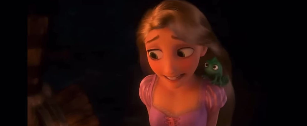 In this scene Rapunzel and Flynn are walking through a tunnel after having nearly escaped capture. while walking through the tunnel they start to feel safe and comfortable when suddenly they see that the guards have caught up to them. We chose this scene because you can see the fear in both characters' eyes as they stare directly at danger.